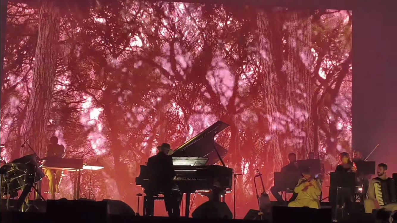 Ο Ludovico Einaudi στεκόταν στη μέση με το πιάνο του, αριστερά του είχε τα κρουστά και τον ηλεκτρισμό (κιθάρα και πλήκτρα), τρία άτομα συνολικά, και δεξιά του τα έγχορδα συν το ακορντεόν (άλλοι και άλλες οχτώ επιπλέον). Ένα video wall στο βάθος της σκηνής να παρουσιάζει κύματα, δάση κ.ο.κ. Δύο video wall εκατέρωθεν της σκηνής ώστε να βλέπουμε τα δάχτυλά του στα πλήκτρα του πιάνου. Εντάξει.