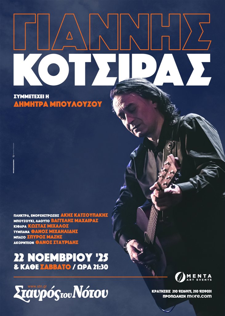 Ο Γιάννης Κότσιρας επιστρέφει στην Κεντρική σκηνή του Σταυρού Του Νότου, για άλλη μία χρονιά, και θα μας κρατάει παρέα κάθε Σάββατο, από τις 22 Νοεμβρίου.