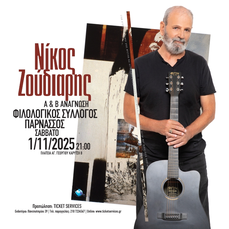 Το Σάββατο 1 Νοεμβρίου ο Νίκος Ζούδιαρης θα παρουσιάσει στον Φιλολογικό Σύλλογο Παρνασσού ένα πρόγραμμα με τίτλο Νίκος Ζούδιαρης.