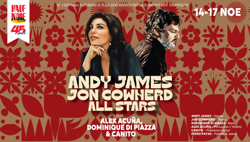 Τέσσερις ξεχωριστές βραδιές μας υπόσχονται η σπουδαία τραγουδίστρια Andy James και ο επονομαζόμενος «μουσικός των μουσικών» πιανίστας κι ενορχηστρωτής Jon Cowherd με την υπέροχη μπάντα του, από την Παρασκευή 14 έως και τη Δευτέρα 17 Νοεμβρίου στο Half Note Jazz Club.