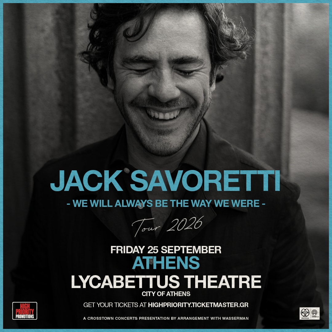 Ο Jack Savoretti έρχεται στην Αθήνα την Παρασκευή 25 Σεπτεμβρίου 2026 στο Δημοτικό Θέατρο Λυκαβηττού, ανοίγοντας το ευρωπαϊκό σκέλος του «We Will Always Be the Way We Were» Tour 2026, τη μεγαλύτερη περιοδεία της καριέρας του.