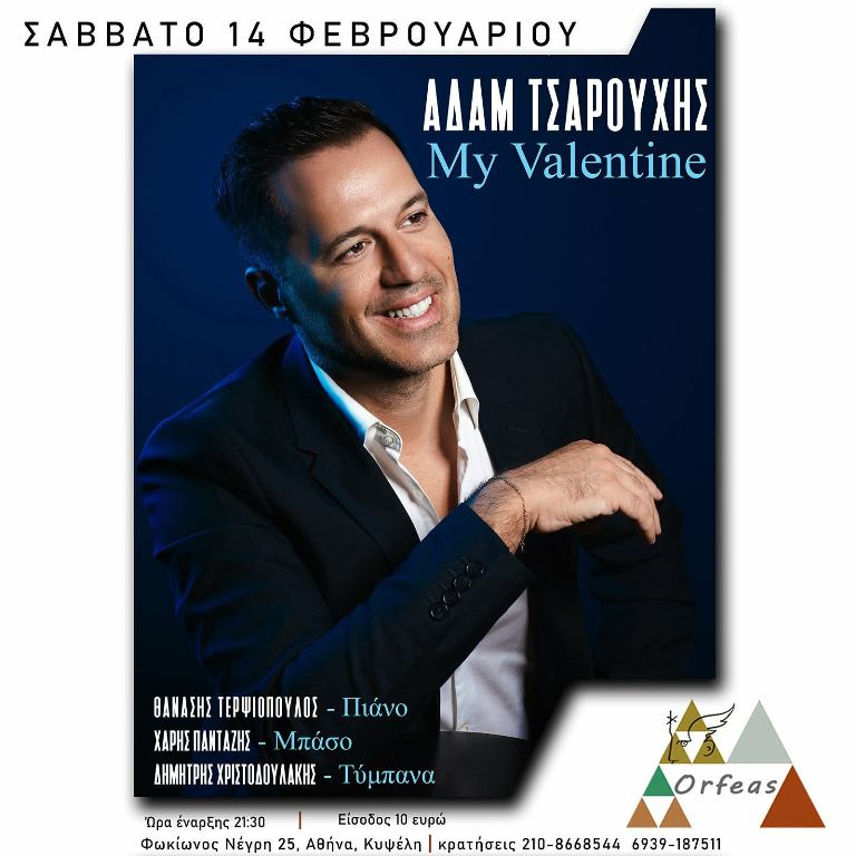 Με τη χαρακτηριστική του φωνή, τη θεατρικότητα και την έντονη σκηνική παρουσία του, ο Αδάμ Τσαρούχης υπόσχεται ένα live γεμάτο συναίσθημα, ρομαντισμό και αγαπημένα τραγούδια που υμνούν την αγάπη. Μια μουσική εμπειρία ιδανική για τη βραδιά του Αγίου Βαλεντίνου, σε έναν ζεστό και ατμοσφαιρικό χώρο.
